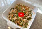 1 – Pré-aqueça o forno a 200°C se você for assar o frango. Se já tem um frango assado, simplesmente corte-o em pedaços pequenos e coloque-o em um recipiente grande. Descarte os ossos e a pele.